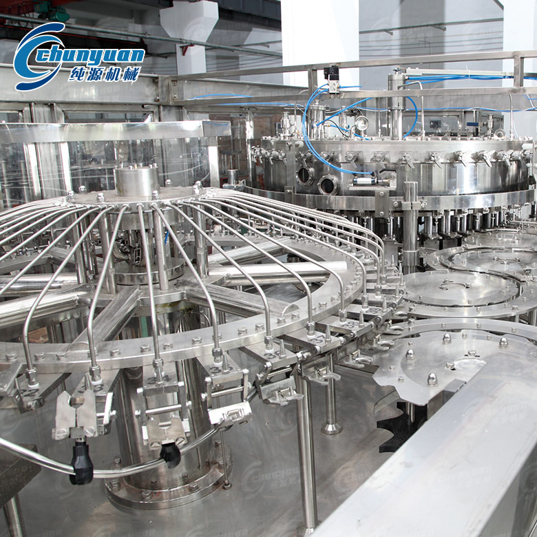 純源機(jī)械廠家供應(yīng)的雪碧含汽飲料機(jī)械集沖洗、灌裝、旋蓋于一體,適用于灌裝雪碧、可樂、碳酸飲料、含汽蘇打水等含汽飲料的聚酯瓶灌裝,全過程實(shí)現(xiàn)自動化。