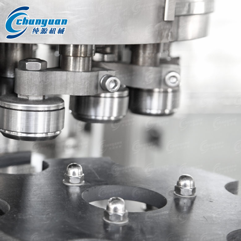 易拉罐椰子汁飲料機(jī)械采用常壓灌裝原理,當(dāng)空罐經(jīng)撥輪進(jìn)入升降托罐盤(pán)后,灌裝閥和空罐對(duì)中,空罐升起并密封,同時(shí)自動(dòng)打開(kāi)灌裝閥的閥口,當(dāng)灌裝液面堵住閥的回氣管口時(shí)停止灌裝。灌好的罐子經(jīng)鉤子鏈送到封口機(jī)頭,蓋子經(jīng)送蓋器及壓頭把蓋子送到罐口上,當(dāng)托罐機(jī)構(gòu)升起時(shí),壓頭壓緊罐口,封口輪先預(yù)封再實(shí)封,罐子封好后被打蓋機(jī)構(gòu)的打頭推出,然后進(jìn)入出罐輸送。