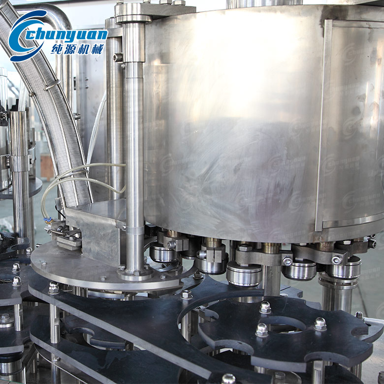 易拉罐椰子汁飲料機(jī)械采用常壓灌裝原理,當(dāng)空罐經(jīng)撥輪進(jìn)入升降托罐盤(pán)后,灌裝閥和空罐對(duì)中,空罐升起并密封,同時(shí)自動(dòng)打開(kāi)灌裝閥的閥口,當(dāng)灌裝液面堵住閥的回氣管口時(shí)停止灌裝。灌好的罐子經(jīng)鉤子鏈送到封口機(jī)頭,蓋子經(jīng)送蓋器及壓頭把蓋子送到罐口上,當(dāng)托罐機(jī)構(gòu)升起時(shí),壓頭壓緊罐口,封口輪先預(yù)封再實(shí)封,罐子封好后被打蓋機(jī)構(gòu)的打頭推出,然后進(jìn)入出罐輸送。